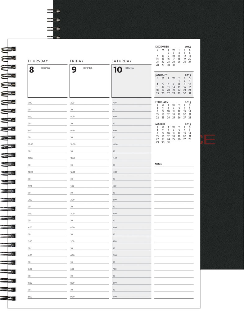 Premium leather front cover with black chipboard back cover. Appointment weekly stock calendar filler - includes month-at-a-glance before each month of weekly pages. Includes 1-color foil or deboss imprint. Black wire standard (more colors available).