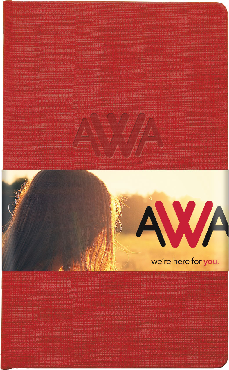 Textured, faux leather hard cover journal available in Black, Blue, Orange, Red, Lime and Silver Metallic, Navy Metallic and Titanium Metallic. Includes a blind deboss imprint and a custom full-color Graphic Wrap. Features a pocket on inside back cover, matching satin ribbon bookmark, elastic privacy closure and 80 sheets of ruled, quality wood-free paper. Imported book, decorated in the USA.
