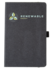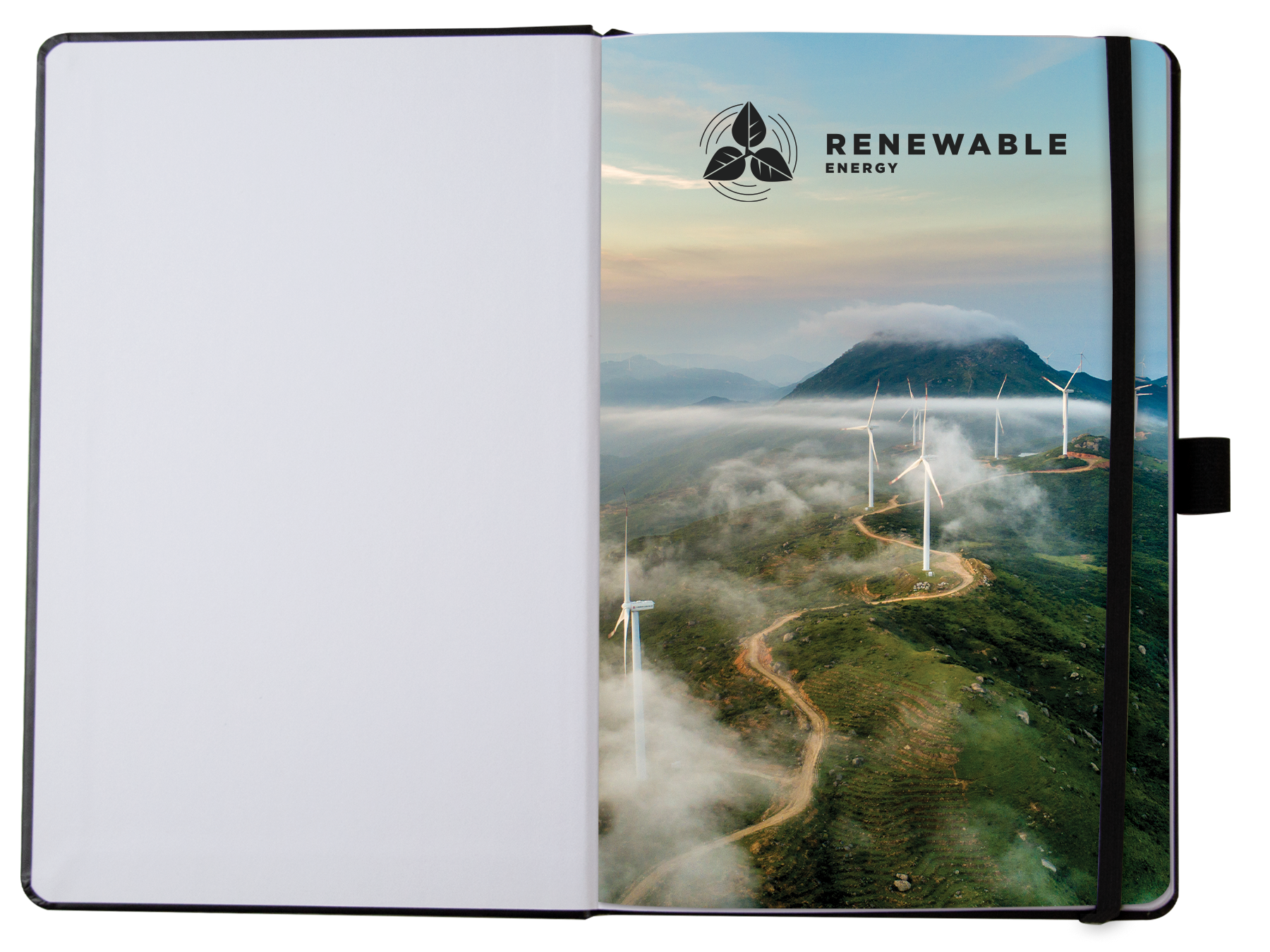 This eco-friendly Recycled Leather Journal features a recycled leather hard cover and 80 sheets of lined FSC®-certified filler. Contains a back paper pocket, color-matching elastic closure, pen loop, and ribbon page marker. Includes a blind deboss imprint up to 16 square inches, and (1) full-color 1-sided tip-in page at front. Imported book, decorated in the USA.