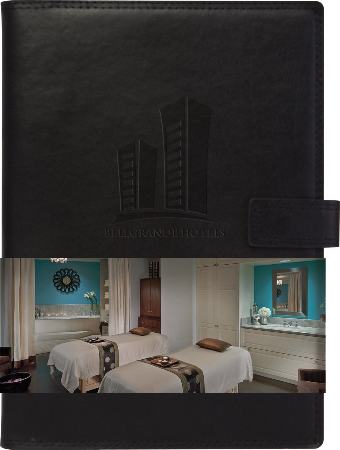 The Uptown Refillable Leather Notebook features a genuine black leather soft cover with a double-stitched border, a magnetic tab closure, a business card slot, and an elastic pen loop. It contains a refillable pad of 128 sheets of FSC® Mix lined paper with blue and silver ribbon page markers. Includes a blind deboss up to 16 sq. inches on the front cover and a custom full-color graphic wrap. Imported book, decorated in the USA. To purchase refills for this product, please click here.