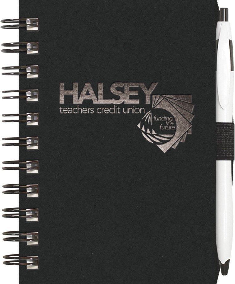 Front cover available in Blue, Red, or Black heavy paperboard. Includes 1-color foil imprint (black, white, silver, or gold only - limited to standard 16 square inches imprint area - positions A, B, or C only). 100 sheets of lined filler. PenPort back cover with Cougar pen. Black wire binding. Custom imprinted front cover only; no other customizations available.